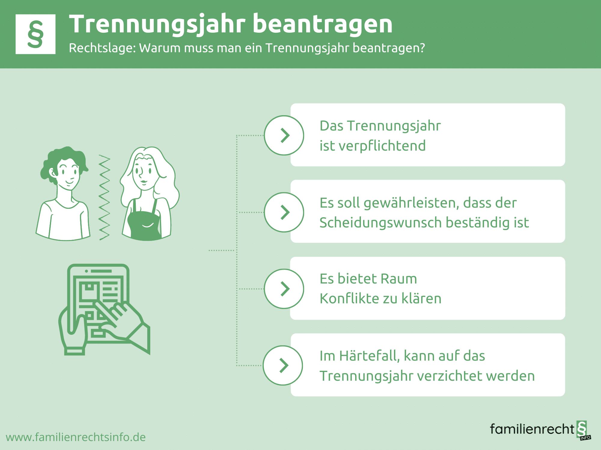 Laut dem §1566 Bürgerliches Gesetzbuch (BGB) müssen Eheleute für mindestens ein Jahr Tisch und Bett trennen, bevor es möglich ist, eine Scheidung einzureichen. Der Sinn hinter dieser Regelung liegt darin, dass sich die Eheleute im Rahmen des Trennungsjahres darüber klar werden sollen, ob sie ihre Ehe wirklich endgültig beenden wollen – oder eine Chance auf eine Versöhnung sehen. Erst dann, wenn das Trennungsjahr vollzogen wurde, sieht auch das Familiengericht die Ehe wirklich als gescheitert an und die Eheleute können offiziell Scheidung einreichen. Ehegatten müssen direkt nach der Trennung also das Trennungsjahr beantragen.